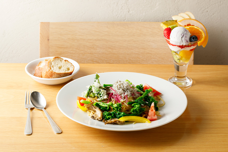 -菜の花とじゃこのパスタ(バゲット付き)&パフェセット
